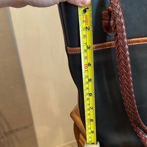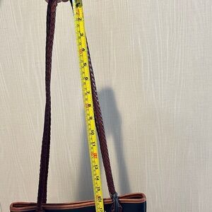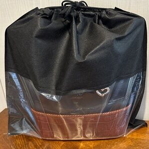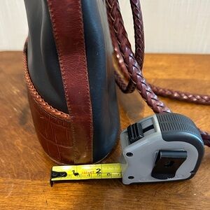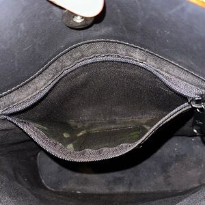 This stylish tote bag features a sleek black body with rich brown accents, perfect for any occasion. The elegant design is complemented by heart-shaped embellishments, adding a touch of charm to your ensemble. USED… has discoloration on hardware, minor wear on bottom of bag, discoloration inside zipper pocket. Please view photos. UNBRANDED dust bag included.