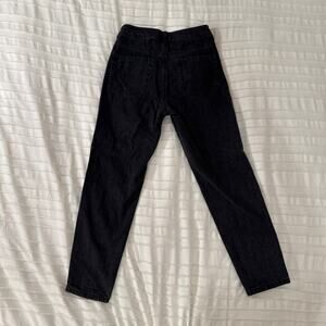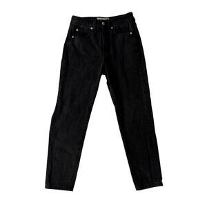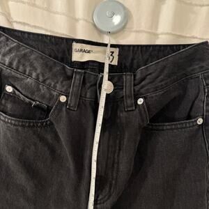Garage black high-rise straight leg jeans in a washed grunge aesthetic with 5-pocket styling, zip fly, classic mom jean silhouette, vintage-inspired streetwear vibe, cropped ankle length, minimalist Y2K edge, and everyday casual denim essential.
