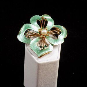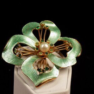 Vintage Weiss Brooch Floral Green Enamel Rhinestone Pearl Gold-tone