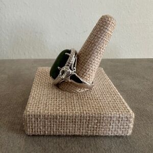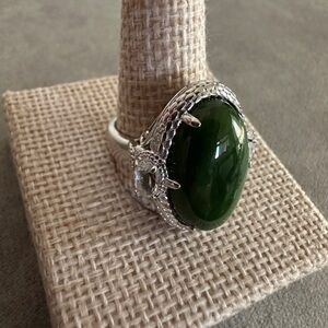 This elegant ring features a stunning green nephrite jade stone with white topaz accents set in a classic sterling silver band. Perfect for adding a touch of sophistication to any outfit.