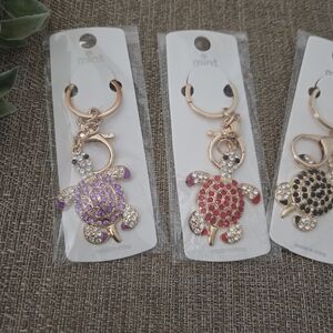 Charming turtle bag charms/keychains by Mint. Features vibrant purple, red, black, and pink accents.