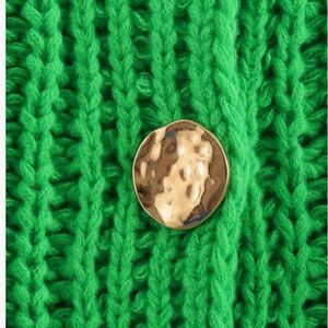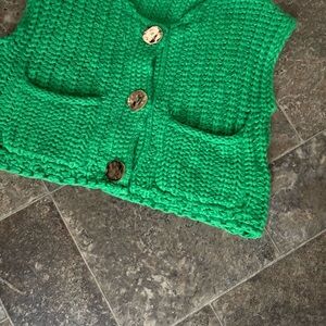 Bright green knit vest featuring stylish gold buttons. Perfect for a bold look.