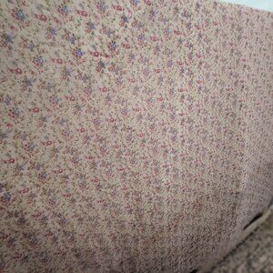 Lightweight sheer floral woven fabric with a soft, airy drape. Delicate pink and blue flowers on a cream background — perfect for blouses, scarves, layering pieces, cottagecore dresses, and soft craft projects.