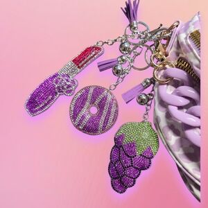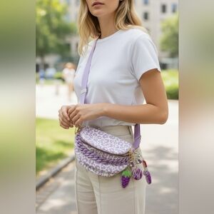 Elegant leopard crossbody bag in purple and light purple. Features a striking light purple and gold chain and playful charms. Ideal for a stylish statement.