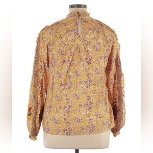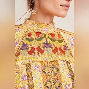 Bring on the boho vibes with this eye-catching Goldie Embroidered Blouse by Maeve for Anthropologie. Bursting with rich mustard-yellow hues, intricate beaded accents, and vibrant floral embroidery, this top is an artful blend of color and texture. The mock neckline and billowy long sleeves give it a flattering, vintage-inspired silhouette that pairs effortlessly with high-rise denim or a flowing maxi skirt.
