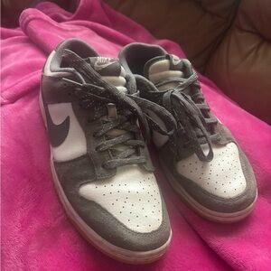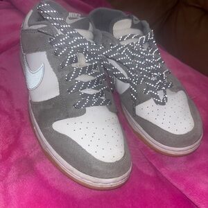 Nike athletic shoes in dark gray and white. Sleek design with lace-up closure. Smoke free home used just need to be cleaned. Very comfortable.