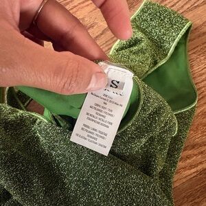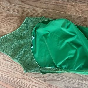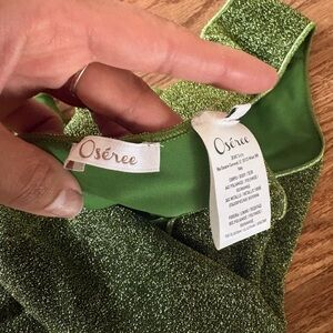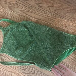 Shimmering green one piece by Oseree. Features a sparkling glitter finish. Perfect for a standout beach look.