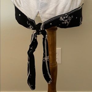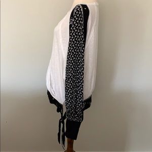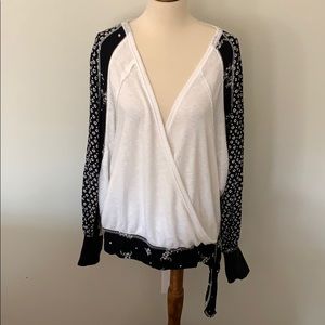 New without tags! Free People blouse size lg. White textured knit body with black and white floral pattern sleeves. Deep v neck, perfect for layering! Has a tie on the side for looks.