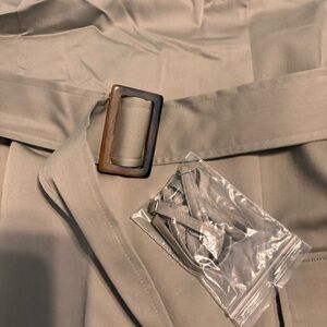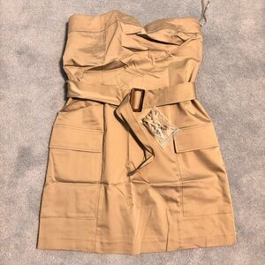 Elegant strapless dress. Features a belted waist. Stylish front pockets.