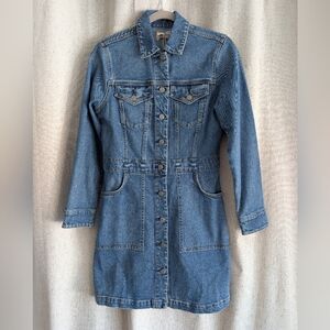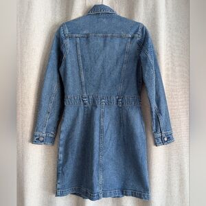 Detail: denim dress with trucker jacket detail at the top. metal shank closure. Medium indigo wash. Comfort stretch.