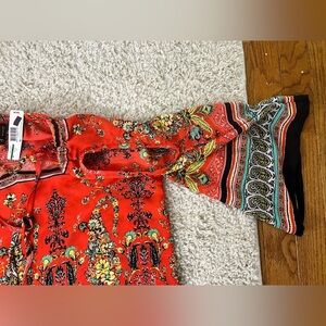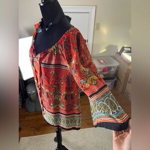 Embrace a bohemian vibe with this vibrant red shoulder peep top. Perfect for casual outings, it features a striking pattern that adds a touch of elegance to your look.