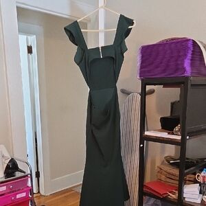 Stunning dress in a rich emerald shade. Features elegant ruffle detail. Perfect for special occasions. Has a beautiful open back