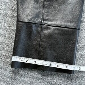 Features: Adjustable belted waist with buckle closure and rear lace panel, full-length side leg zippers with snap-tab cuffs, stretch panels at the inner thighs for ease of movement, and unlined suede-style leather backing on the interior.