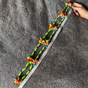 Cute vintage plastic necklace that would be fun for a Hawaiian or other party. Brighten up your outfit with this vibrant fruit-themed necklace. Featuring a playful mix of red, yellow, orange, green, and purple beads, this accessory is perfect for adding a splash of color to any look.