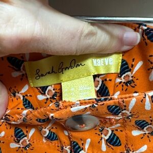 Bright orange pants with playful bee design, in blue, black and white. These look great with a black or white top and a blue jean jacket. Ideal for a standout style. Stretchy fabric. Ideal for size 14. Always go down a size in these.