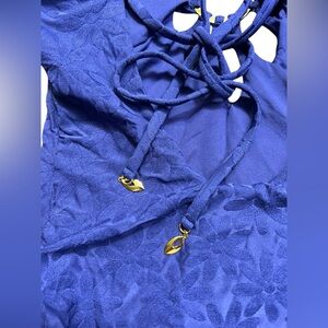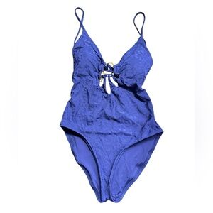 This Trina Turk Joplin Jacquard Petal Cutout Plunge One Piece Swimsuit, in the color Navy Blue, is brand new! The product description is: