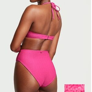 Hot pink textured VS Swim bikini set with push up 32DD underwire top and size small high-waist twist bottoms. Ultra flattering sculpted fit with supportive lift and a retro high-rise silhouette that’s trending right now.