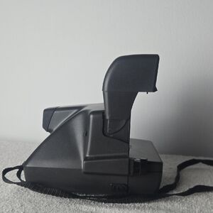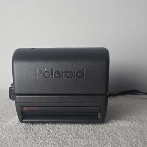 Polaroid OneStep camera in sleek black. Features red accents. Perfect for instant photography.