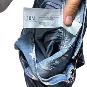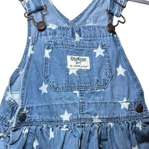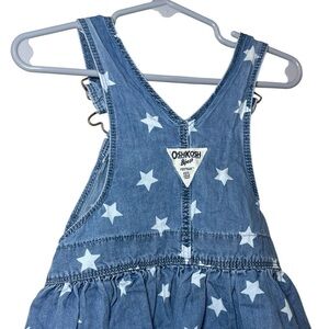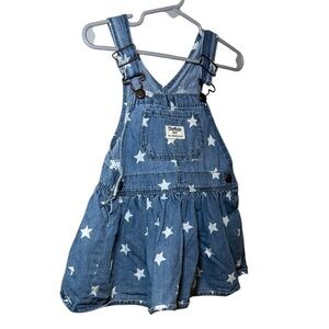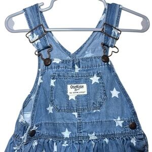 Oshkosh B’gosh Baby Girl Starry Denim Skirtall Size 18 Months. Features include adjustable straps, genuine metal hardware, classic Vestbak style, allover star print, authentic indigo denim, functional bib pocket, star-spangled jumper for summer celebrations! 100% Cotton. Good worn condition, no notable flaws. Smoke free home.