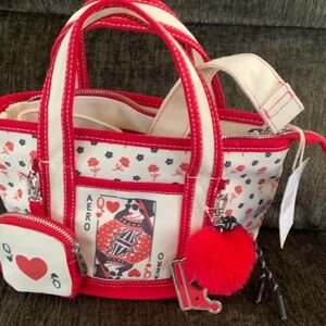 🆕- So Cute!! A must have for the summer! This AEROPOSTALE Mini tote/ shoulder bag features matching charm coin purse & a fluffy heart with a red outlined crown & black laces charm, with card motif. Red trim and cream base. Queen of hearts card with AERO written on both sides. Roses & flower pattern. One inner zipper closure side pocket and one inner open side pocket.