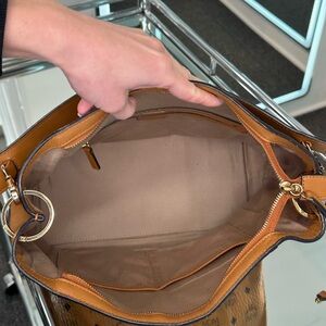 Brown leather, monogram pattern, gold-tone hardware detachable flat shoulder strap, snap closure exterior pocket, top zipper, interior zip pocket, dual open pockets, canvas interior