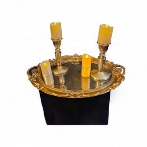 Enhance your home bath decor with this elegant gold candle holder tray. Perfect for creating a warm and inviting atmosphere.