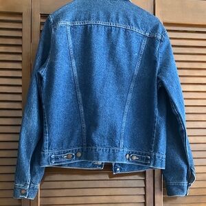 Timeless denim jacket with button front. Features two chest pockets. Perfect for casual wear.