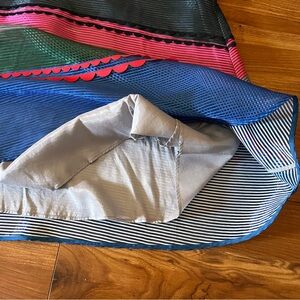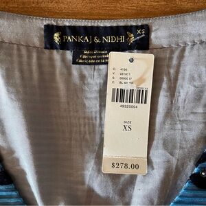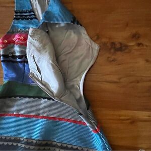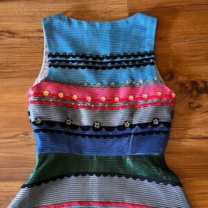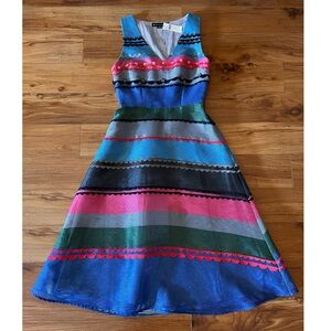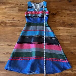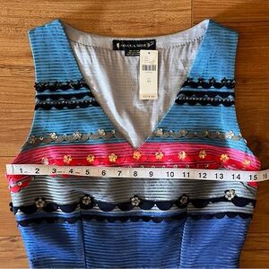 rayon/poly, side zipper closure, v neckline, colorful stripes, beading and sequin detail, lined, approx measurements shown, new with tags, midi silhouette, fit and flare style