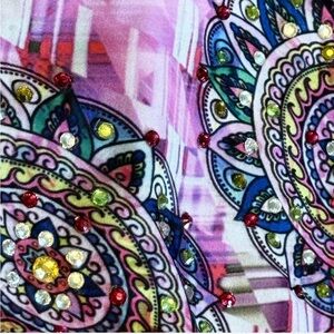 Elegant backless dress by India Boutique. Features a vibrant blue and pink pattern. Perfect for summer outings.