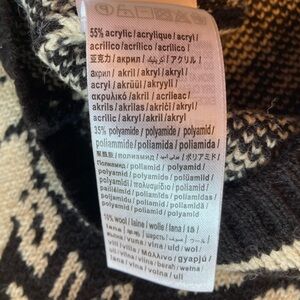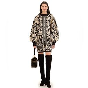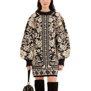 Embrace the enchanting allure of the Black Pineapple Garden Mini Sweater Dress by FARM Rio. This cozy creation features a sophisticated high neckline and an entrancing contrast of black and cream, with whimsical pineapple and botanical illustrations. The snug, ribbed texture at the cuffson these balloon sleeves ensures a flattering silhouette, inviting you to indulge in the unique charm of this knit masterpiece. Versatile addition to your wardrobe - can be worn as a dress or a tunic style sweater!