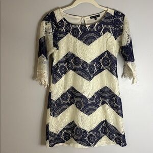 Charming kids dress with navy and white lace. Perfect for formal events. Stylish and sophisticated design.