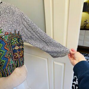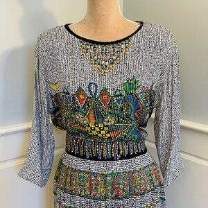 Vintage beaded blouse and skirt set, midi skirt and matching top, black and white micro dot print, abstract geometric motif, hand applied beaded neckline with 14 graduated rows, intricate beadwork detail, subtle tribal inspired design, soft draped cropped length blouse with 3/4 length sleeves, shoulder pads, high rise back elastic waist skirt with side zip, midi length skirt, side slits at each side, lightweight fluid fabric, statement set, elevated bohemian, global artisan aesthetic. I have 3 listings from this Dorothy Schoelen collection, see the other listed pieces.