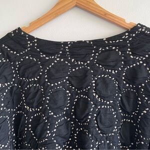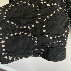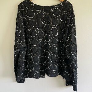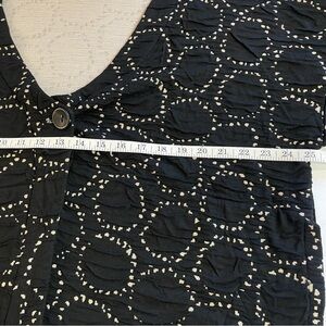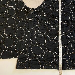 Stylish black cardigan with cream color circular patterns. Features a front button closure & side pockets