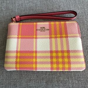 Chic Coach wristlet with a bold plaid pattern. Features pink and yellow hues. Ideal for essentials. This is new without tags. It was never used.