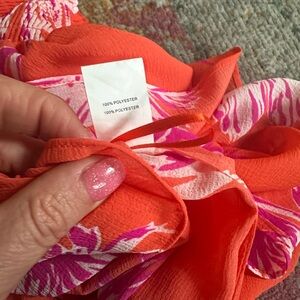 Vibrant coral and pink floral mini skirt by Ramy Brook. Features a flattering smocked waistband, tiered ruffle layers, and lightweight chiffon fabric that moves beautifully. The elastic waist makes it comfortable and easy to wear while still looking polished and elevated.