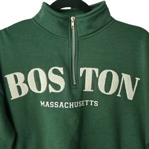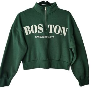 Cropped quarter-zip sweatshirt in a rich forest green features a textured "BOSTON" chenille patch across the chest with "MASSACHUSETTS" printed below. Designed with a cozy fleece lining, drop shoulders, and a ribbed hem and cuffs for a relaxed yet structured fit. The silver-tone hardware adds a clean finish to this collegiate-inspired piece.