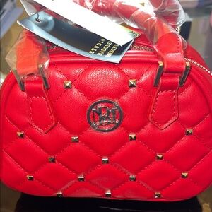 Stylish red quilted handbag featuring chic stud accents. Perfect for adding a bold touch to any outfit.