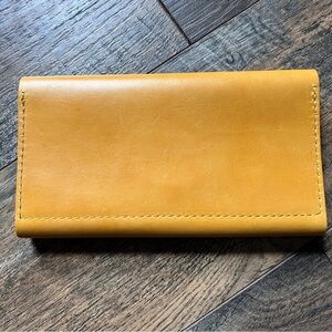 Beautiful leather clutch style wallet in color sunflower. Used only once. There are some very minor scratches that come with the territory of using leather - see pics.