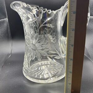 Beautifully crafted clear crystal vase with intricate floral engravings. Perfect for home decor. Approximately 7.5 in tall from sout to handle and 7.5 in tall.