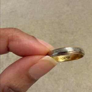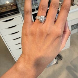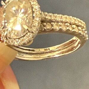 This is going to be sold as a set. There’s 3 rings in total. Two weddings bands and one engagement ring intended to be worn as the first photo. Together they look like one larger ring (there’s 3 rings). The engagement ring and one of the wedding bands are joined together and the other wedding band (second photo) is separate. The two skinnier wedding bands are 10 k white gold with smaller diamonds on the bands. The engagement ring is stamped 14 k gold with a center stone of moissonite. Check all photos for the stamps. This fits my 4.5 ring finger.