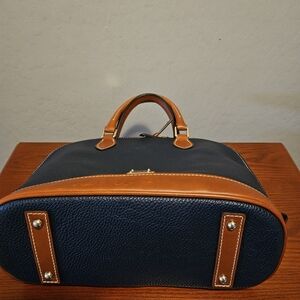 Like NEW ☆ Dooney & Bourke Zip Zip Satchel Handbag, PERFECT! Color: Navy and British Tan. Zip top close, multi pocket interior. All pebbled leather. Authentic. No shoulder strap. Used one time ~ PERFECT!