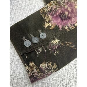The J. Jill Velvet Blazer Jacket in size S offers a romantic and earthy vibe with its floral green design, perfect for casual, business, or travel occasions. Made from a cotton blend velvet fabric, this mid-length jacket features long sleeves and a button closure. The vintage-inspired piece is ideal for fall, winter, and spring seasons, adding a touch of bohemian and classic style to your wardrobe with its unique flower and outdoor theme.