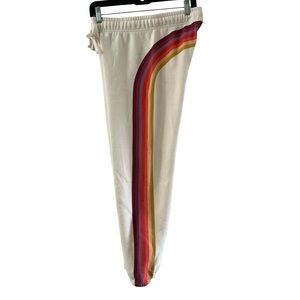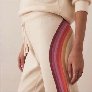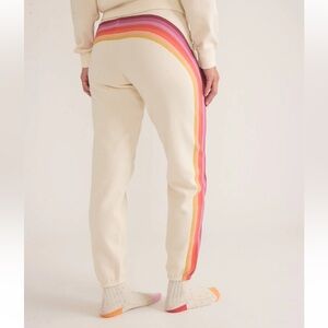 marine layer sweatpants, rainbow stripe joggers, cream lounge pants, retro stripe pants, women’s cotton joggers, casual athleisure bottoms, coastal casual style, fleece sweatpants women