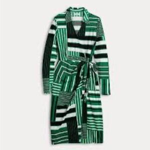 Stylish midi dress with bold green and black stripes. Features a flattering tie waist and long sleeves. Perfect for any occasion.