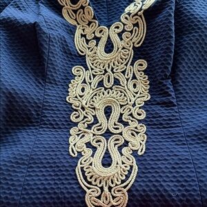 Stylish blue mini dress by Lilly Pulitzer. Features intricate vintage gold accents. Ideal for elegant occasions.