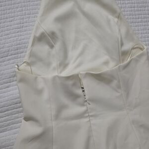 Elegant cream midi dress. Features silver floral design. Halter neckline. Perfect for special occasions.