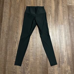 These are lululemon Align High-Rise leggings, designed to feel weightless and buttery-soft for low-impact workouts like yoga. No pocket so no size dot. These are a dark forest green, full length. Spandex material