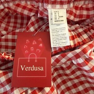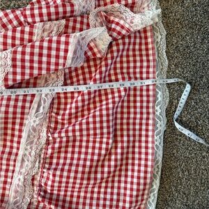 Elevate your style with this chic red gingham high-low skirt, featuring elegant lace detailing. Perfect for a casual day out or a stylish brunch.