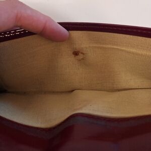 Res stain in interior *see photo*. This stylish burgundy clutch is perfect for any occasion. Its sleek design and rich color make it a must-have accessory.