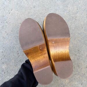 Elegant black leather mules by Tory Burch. Features a stylish gold chain detail. Perfect for versatile wear.
